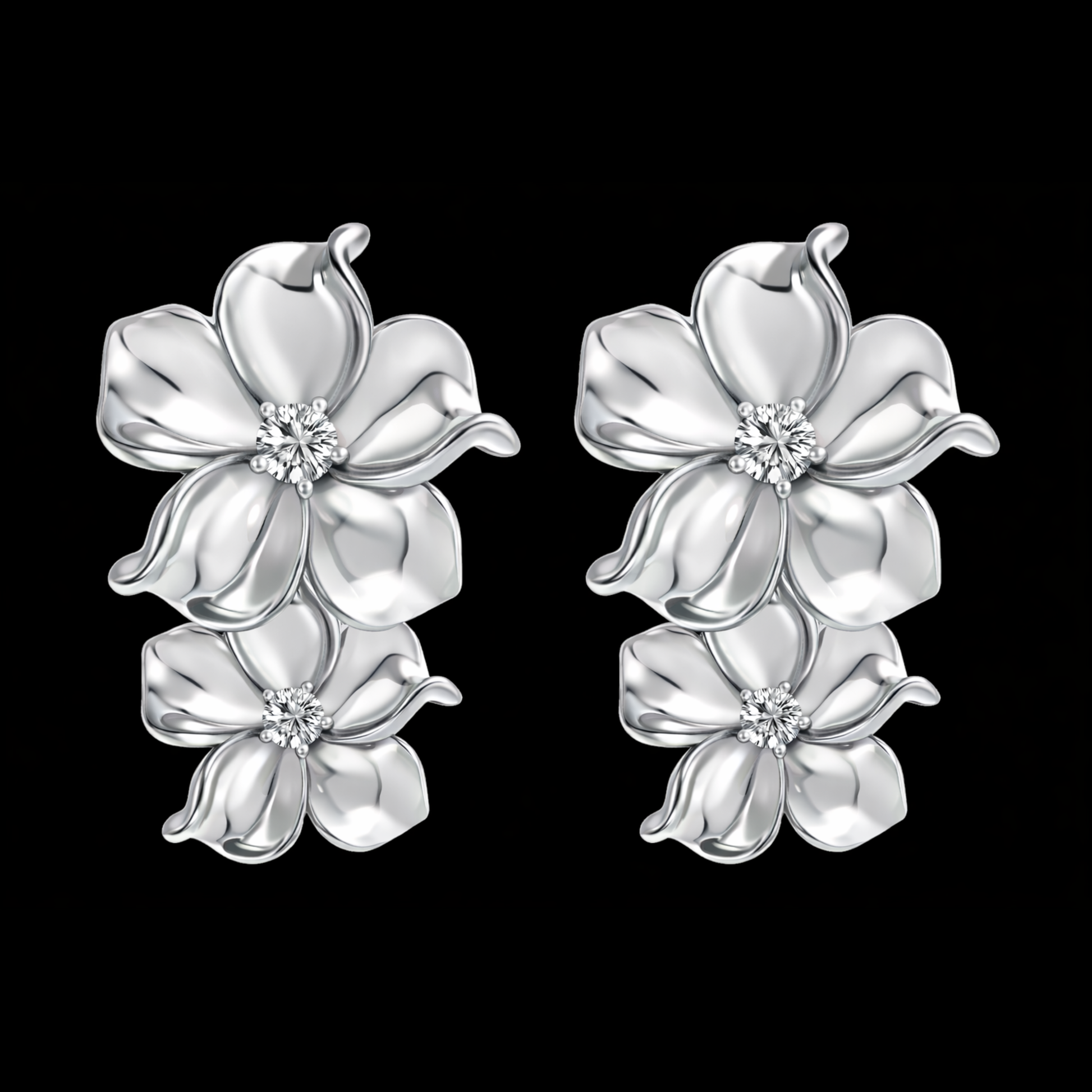 Our Bloom Duo Earrings are a refined statement piece featuring two sculpted flowers with softly curved petals and a sparkling center stone. The layered design adds elegant depth and shine, creating a feminine yet eye-catching look. Timeless and polished, these earrings are perfect for both everyday wear and special occasions.