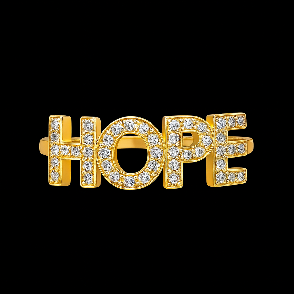 Our HOPE Ring is a dazzling statement piece that embodies strength, positivity, and elegance. Crafted in gold-toned metal and adorned with shimmering stones, this ring spells out "HOPE", serving as a reminder to stay resilient and believe in brighter days. Perfect for wearing alone as an empowering centerpiece or stacking with other rings for a striking look.